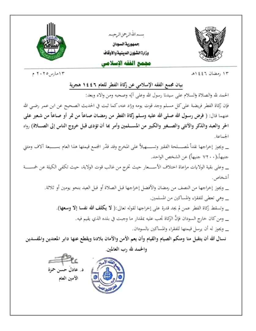 مجمع الفقه الإسلامي السوداني يحدد زكاة الفطر لهذا العام بــ 7200 جنيهاً للفرد
