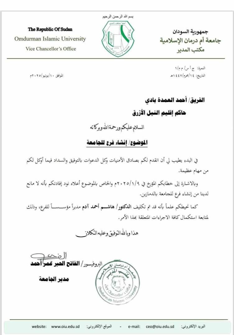 وسط أجواء احتفالية من قبل أبناء النيل الازرق بعد استماعهم لخطاب حاكم النبل الازرق الفريق أحمد العمدة بادي الذي طالب بإنشاء صرح شامخ في النيل الازرق وعلي الفور وافقت تلك الجهات المعنية بافتتاح فرع لجامعة أمدرمان الإسلامية في إقليم النيل الأزرق وتعيين/الدكتور هاشم احمد ادم مديراً لفرع الجامعة الإسلامية بالنيل الازرق. يعد خطوة تنموية كبيرة وهامة للغاية، حيث يمثل هذا الفرع إضافة حقيقية للإقليم وفرصة لتوفير التعليم العالي للطلاب. يأتي هذا الإنجاز بعد جهد كبير بذلته حكومة الإقليم والإدارة الأهلية.