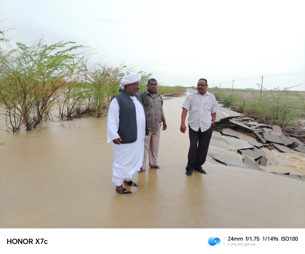 ورافقه خلال الجولة الباشمهندس علي أحمد ناظر الجميلاب والكرياتي ، ومدير جهاز الأمن بالمحلية ، حيث اطّلع الوفد على حجم الأضرار عن كثب واستمع إلى إيجاز شامل من لجان الطوارئ وأعيان المنطقة حول مدى تأثير الكسر في انسياب المياه وتدفقها نحو الأحياء السكنية .