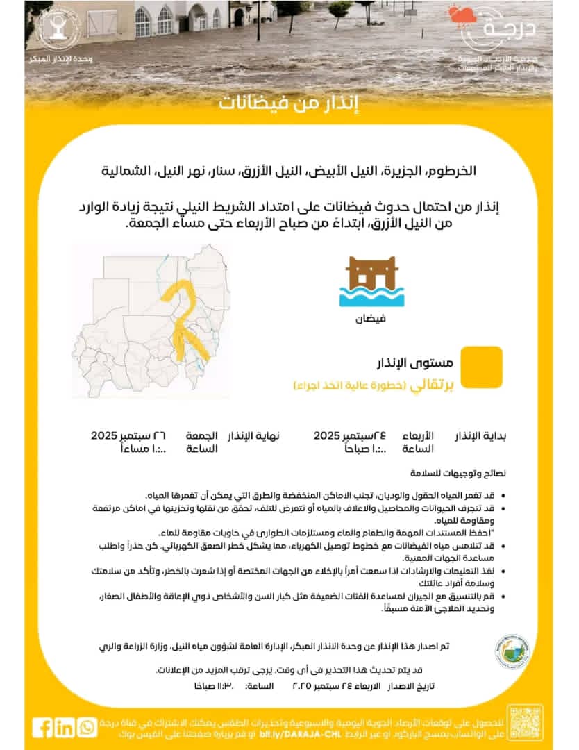 حذرت الهيئة العامة للأرصاد الجوية و وزارة الزراعة والري من احتمال حدوث فيضانات على امتداد الشريط النيلي نتيجة زيادة الوارد من النيل الأزرق . وذلك إبتداء من صباح اليوم الأربعاء حتى مساء الجمعة وشمل التحذير ولايات : الخرطوم، الجزيرة، النيل الأبيض، النيل الأزرق، سنار، نهر النيل، و الشمالية .