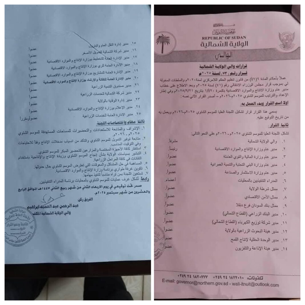 أصدر والي الشمالية الفريق ركن عبد الرحمن عبد الحميد ابراهيم، القرار رقم ٧٣ لسنة ٢٠٢٥م قضى بتشكيل اللجنة العليا للموسم الشتوي ٢٠٢٥م-٢٠٢٦م٠ونص قرار تشكيل اللجنة أن يكون والي الشمالية مشرفاً ،مدير عام وزارة الإنتاج والموارد الإقتصادية ، رئيساً.
