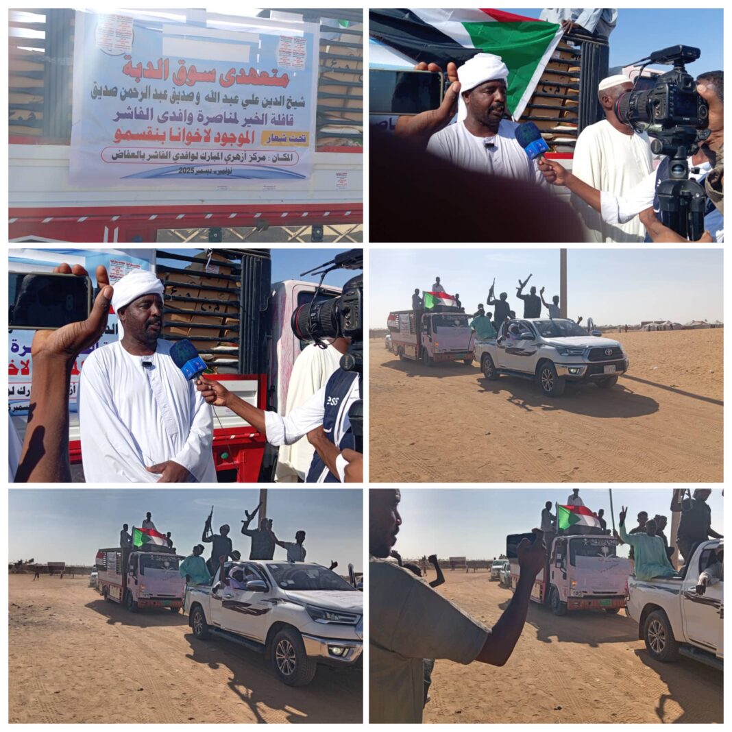 واشاد الأستاذ اشرف سري متحدث عن أهل الدبة متعهدي سوق الدبة الذين دعموا هذه القافلة النوعية التي تحتوي على مواد غذائية وإيوائية بعدد (١٠٠) كرتون بلح و(١٠٠) شوال سكر و(٣٠٠) كرتونة مكرونه وعدد من الدفايات وهذه من أبناء محلية الدبة أبت نفوسهم الا ان يشاركو اهل الفاشر في هذه المحنه .