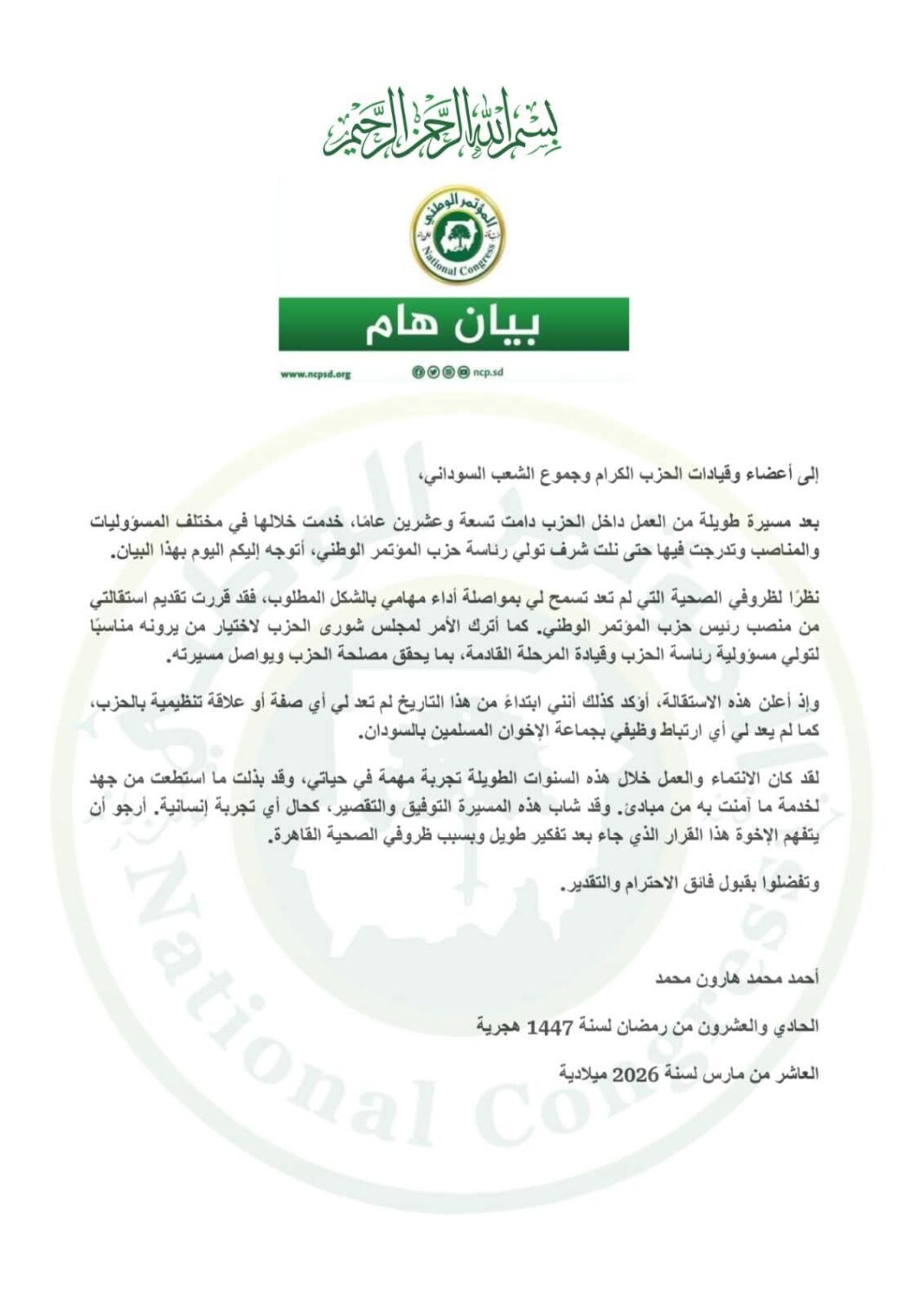 نظرًا لظروفي الصحية التي لم تعد تسمح لي بمواصلة أداء مهامي بالشكل المطلوب، فقد قررت تقديم استقالتي من منصب رئيس حزب المؤتمر الوطني. كما أترك الأمر لمجلس شورى الحزب لاختيار من يرونه مناسبًا لتولي مسؤولية رئاسة الحزب وقيادة المرحلة القادمة، بما يحقق مصلحة الحزب ويواصل مسيرته.
