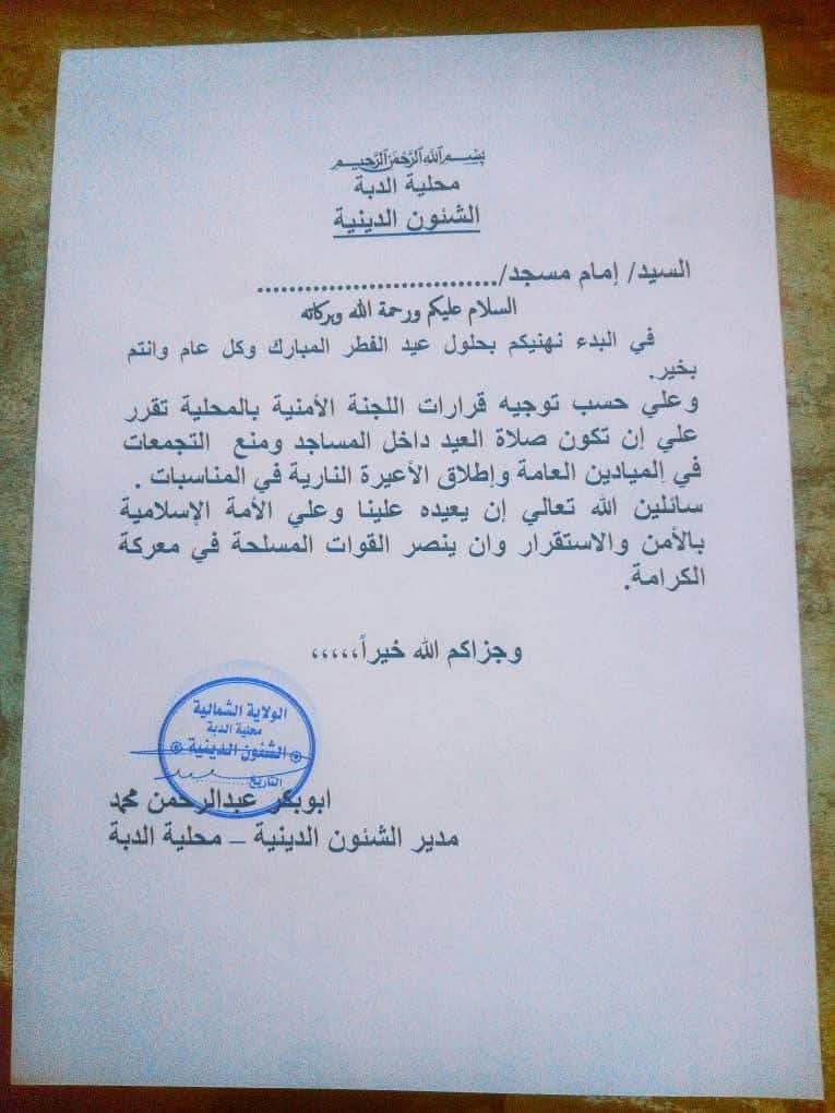 أعلنت محلية الدبة ،عن حظر إقامة صلاة عيد الفطر في الساحات والميادين العامة ، على أن تقام الصلاة داخل المساجد فقط تنفيذا لقرارات لجنة أمن المحلية .