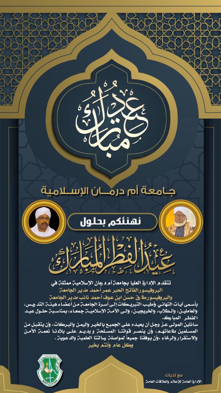 تتقدم الإدارة العليا لجامعة أم درمان الإسلامية ممثلة في البروفيسور الفاتح الحبر عمر أحمد مدير الجامعة والبروفيسور طارق حسن بن عوف نائب مدير الجامعة بأسمى آيات التهاني وأطيب التبريكات إلى أسرة الجامعة من أعضاء هيئة التدريس والعاملين والطلاب والخريجين وإلى الأمة الإسلامية جمعاء والأمة السودانية بمناسبة حلول عيد الفطر المبارك. سائلين الله عز وجل أن يعيده على الجميع بالخير واليمن والبركات وأن يتقبل من المسلمين طاعاتهم وأن ينصر قواتنا المسلحة ويديم على بلادنا نعمة الأمن والاستقرار والرخاء وأن يوفقنا جميعاً لمواصلة رسالتنا العلمية والدعوية.
