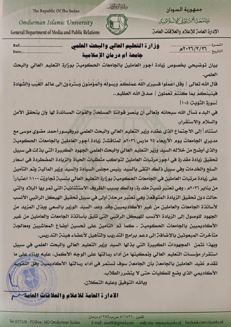 وزارة التعليم العالي والبحث العلمي. جامعة أم درمان الإسلامية بيان توضيحي بخصوص زيادة أجور العاملين بالجامعات الحكومية بوزارة التعليم العالي والبحث العلمي
