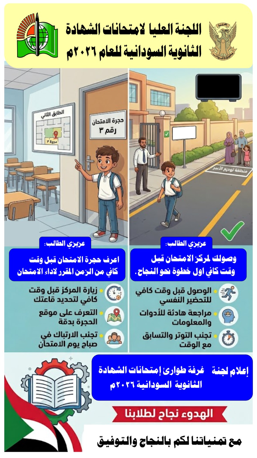 قدمت اللجنة العليا لامتحانات الشهادة الثانوية للعام 20226 ، عدد من النصائح الإرشادات للطلبة والطالبات الجالسين يوم غدا الاثنين ، في البوستر اعلاه اقراه جيدا واتبع الارشادات حتى تعبر بسلام وامان الامتحان
