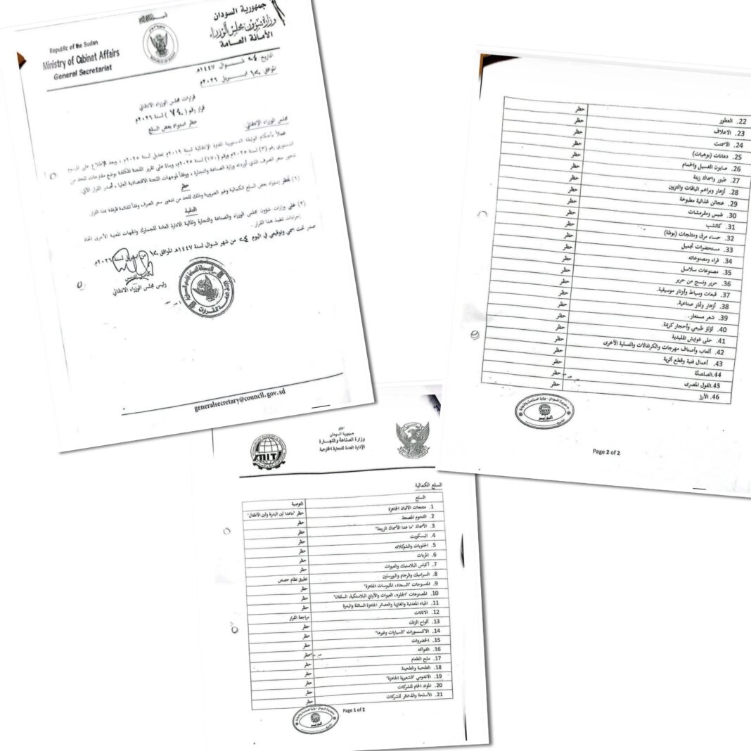 اصدر رئيس الوزراء د. كامل إدريس قرار يحظر استيراد 46 سلعة كمالية للحد من تدهور سعر الصرف ، وذلك في اسارة واضحة للاعتماد على الانتاج المحلي وتشجيع الانتاج والانتاجية ، على رأس السلع الكاتشب والاندومي باعتبارهما الاكثر استهلاكا وضررا